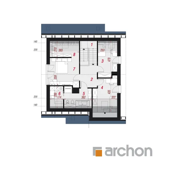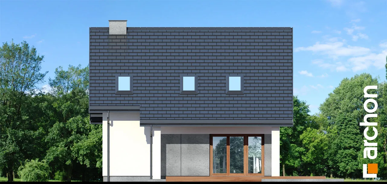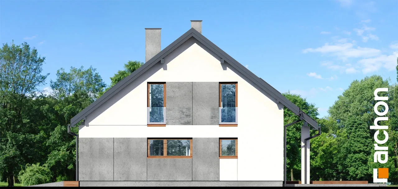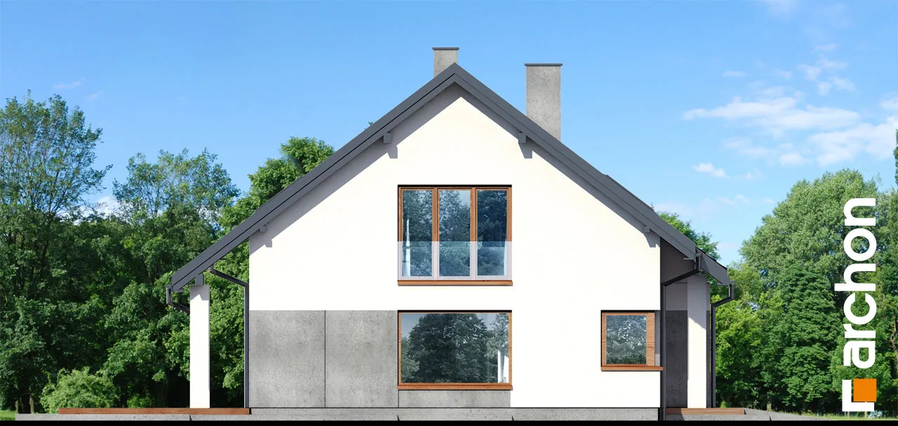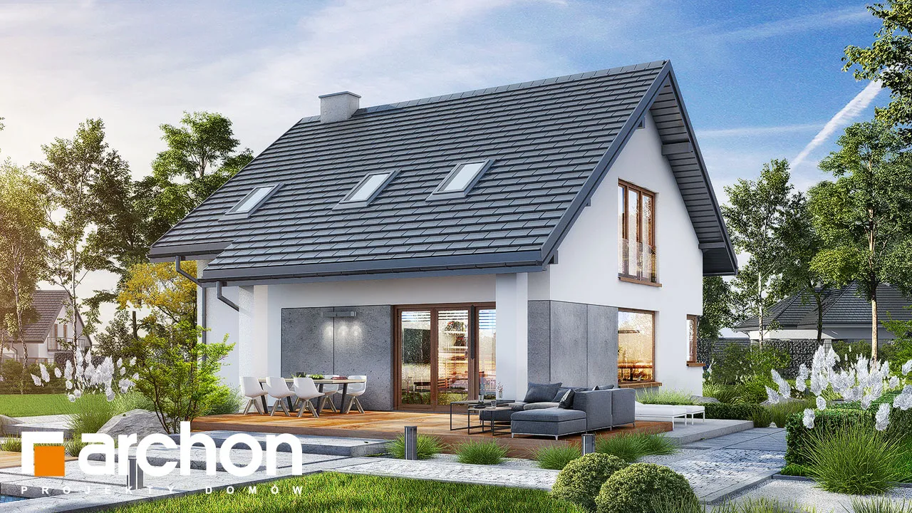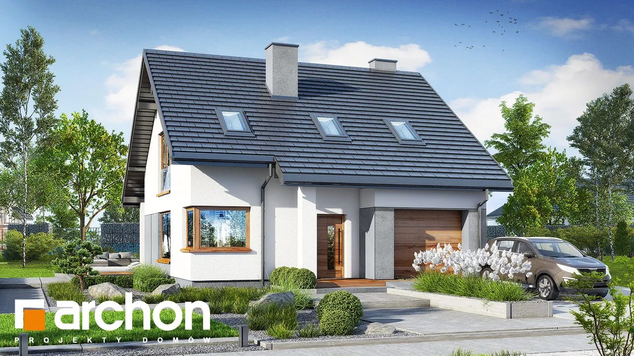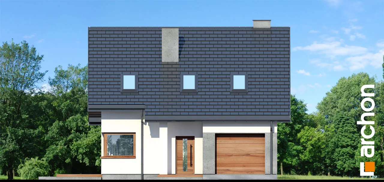 Привлекательный проект односемейного дома с жилой мансардой и гаражом. Простой корпус дома в современной отделке из светлой штукатурки и натуральной облицовки выглядит очень эффектно. Расширенные карнизы создают над входом и зоной террасы практичную защиту от неблагоприятных погодных условий. Терраса, которая увеличивает свободную часть дома, может быть организована в виде летней столовой, плавно соединена с жилой зоной дома. Открытая планировка придает интерьеру простор, а правильно расположенное остекление обеспечивает оптимальное освещение. Гостиная с угловым диваном примыкает к столовой. Здесь удобство работы и хранения гарантируют широкие столешницы и большое количество шкафов. На первом этаже в распоряжении жильцов также туалет, а в гараж можно попасть через тамбур, через который можно пройти в котельную, работающую на твердом топливе. Удобную связь между первым этажом и мансардой обеспечивает двухмаршевая лестница с естественным освещением. Оптимально обустроенная мансарда включает большую спальню родителей с отдельной гардеробной и две комнаты для детей, в каждой из которых есть место для удобных кроватей, письменных столов и шкафов. Кроме того, имеется хорошо оборудованная ванная комната, рядом с которой спроектирована прачечная, отделенная раздвижной дверью. Это очень практичное решение, которое, безусловно, облегчит жильцам правильную организацию работы и поддержание порядка. "Дом в цмине" - это готовый проект дома из коллекции: проекты домов с жилой мансардой, проекты небольших домов, проекты современных домов.