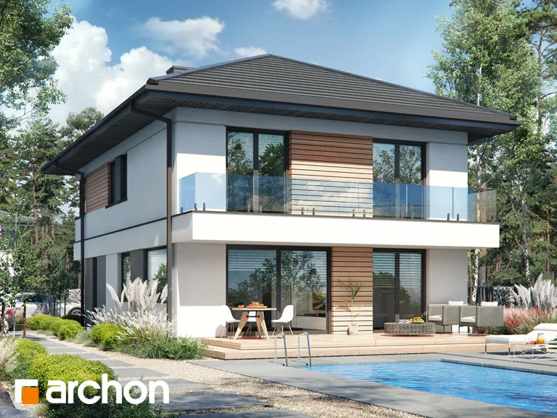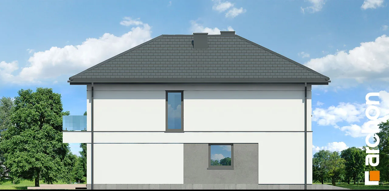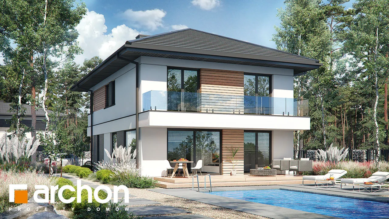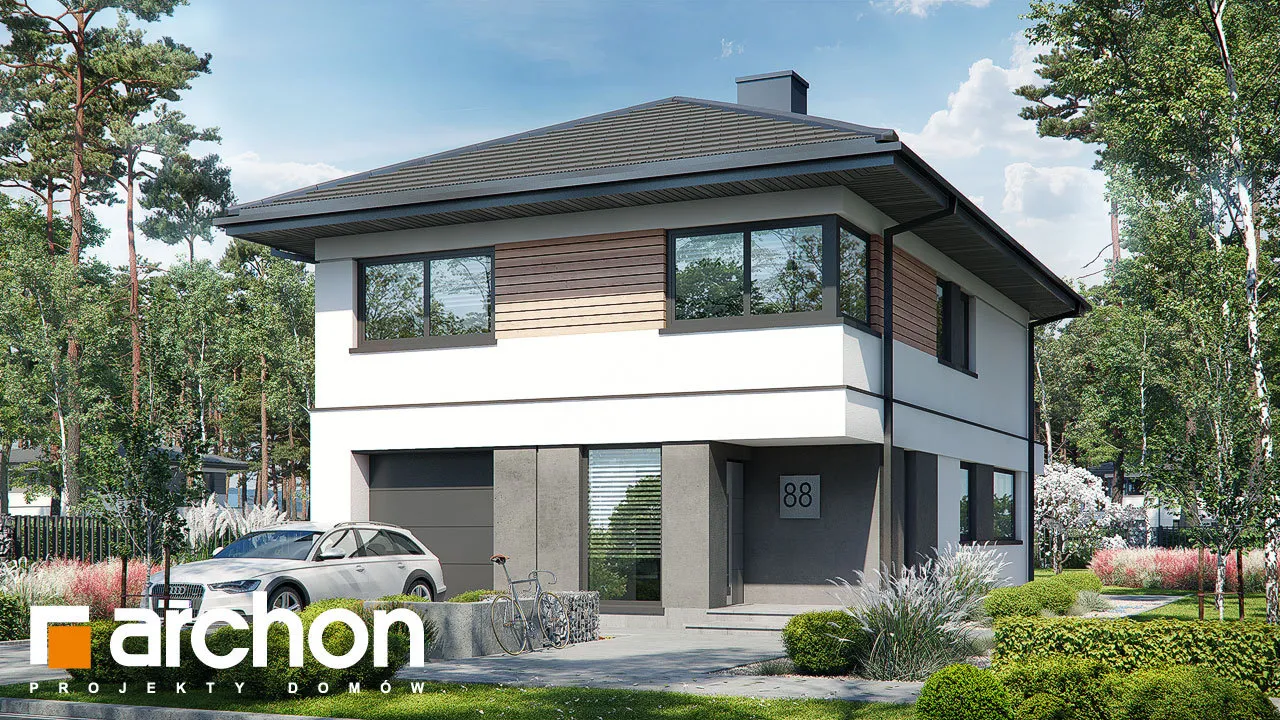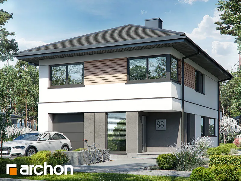 Мы представляем проект двухэтажной виллы с простым, современным корпусом. Белый цвет хорошо сочетается с деревянными изделиями и плиткой графитового цвета, с поверхностями, покрытыми деревянной облицовкой, а также с бетонной структурой, которая была использована для выделения отдельных фрагментов стен здания. Вход на виллу расположен в тихой арке. Вестибюль с высоким остеклением, обеспечивающим идеальное освещение, с вешалками для одежды и удобным сиденьем, соединяется с большим холлом, где предусмотрено место для вместительных шкафов. Жилая зона включает гостиную с мини-кухней с естественным освещением. В центральной части есть место для большого семейного стола. Дополнительное место для хранения обеспечивает кладовая, расположенная под лестницей. Гостиная прекрасно освещена большим окном и широким раздвижным остеклением, которое соединяет ее с просторной садовой террасой, частично закрытой балконом второго этажа. Постояльцы могут организовать здесь комфортную зону отдыха с набором садовой мебели. Рядом с гостиной спроектирована дополнительная комната, которая может служить кабинетом, привлекательности которой добавляет прямая связь с садом. В ванную комнату с душем можно попасть из прихожей, где за раздвижной дверью скрывается котельная. Через тамбур ведет быстрый проход в одноместный гараж. В ночной зоне на втором этаже виллы спроектированы четыре светлые и уютные комнаты, в которых есть место для кровати, письменного стола и шкафов. Две комнаты имеют выход на общий балкон со стороны сада, третья освещается большим угловым остеклением, а комната родителей оборудована гардеробом. Из вестибюля частной зоны можно попасть в удобную ванную комнату с ванной и душем и прилегающую прачечную, обе они имеют естественное освещение. "Вилла Андреа" относится к категории: проекты двухэтажных домов, проекты современных домов, проекты домов с кабинетом на первом этаже, проекты домов с гаражом, проекты вилл и резиденций.