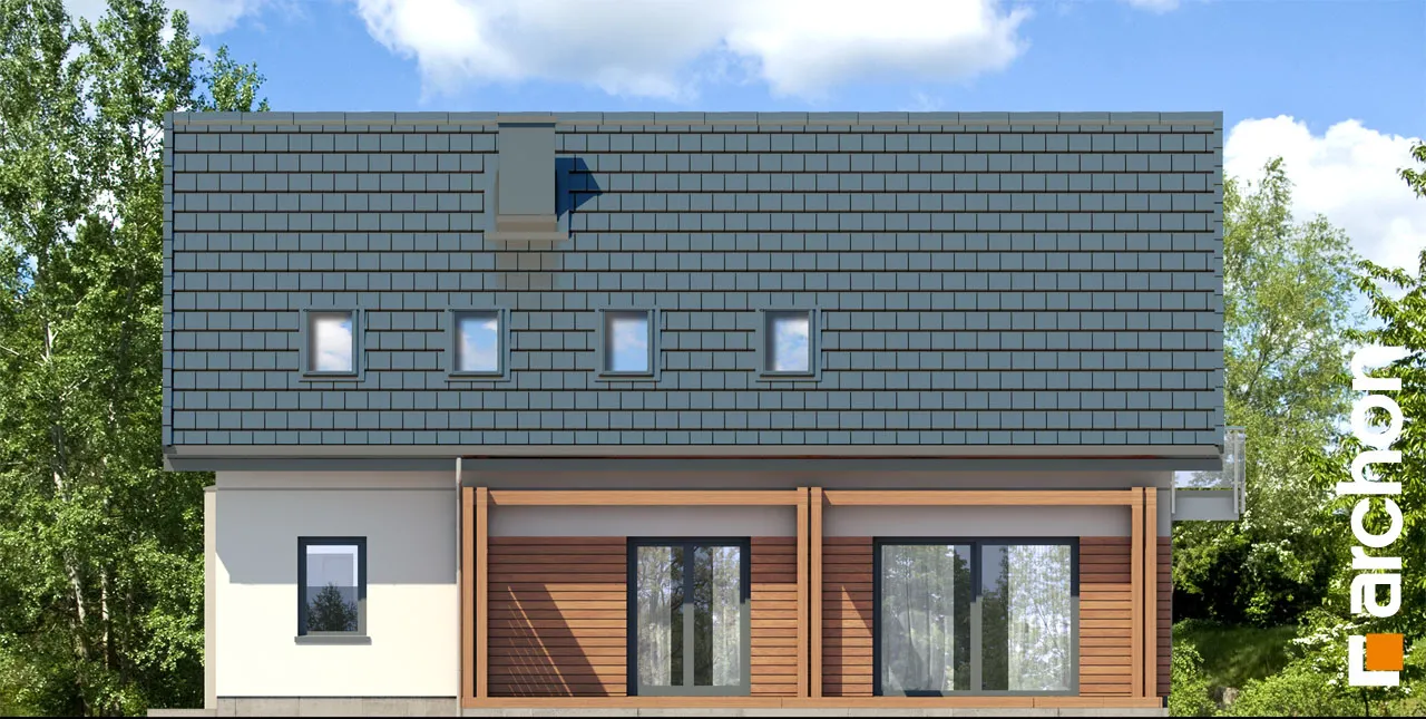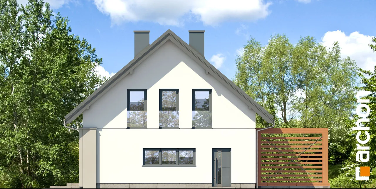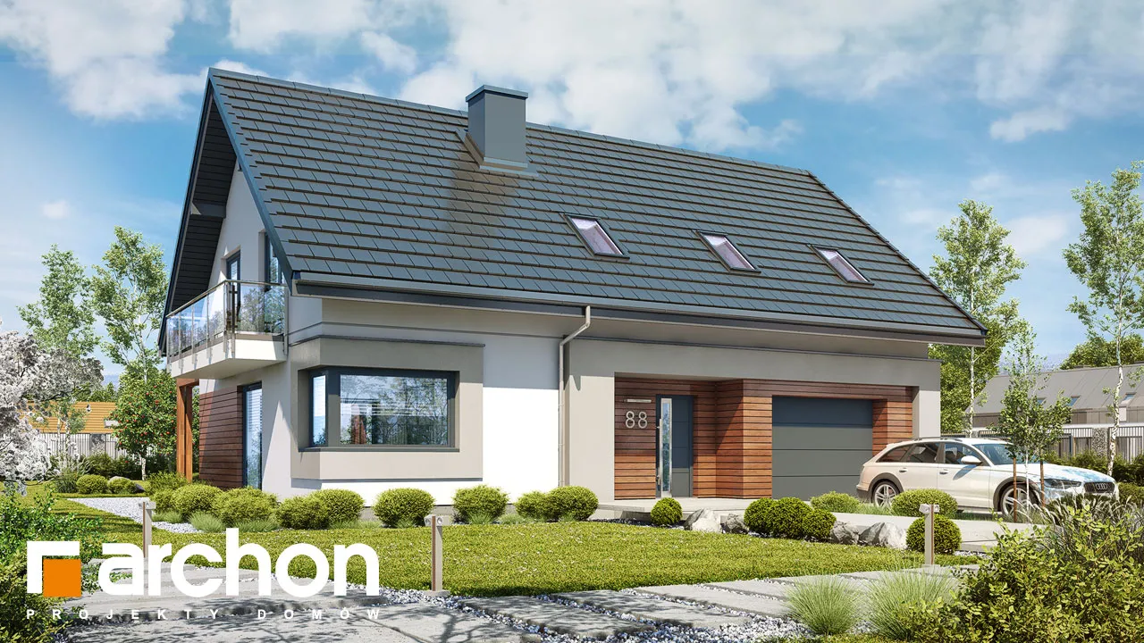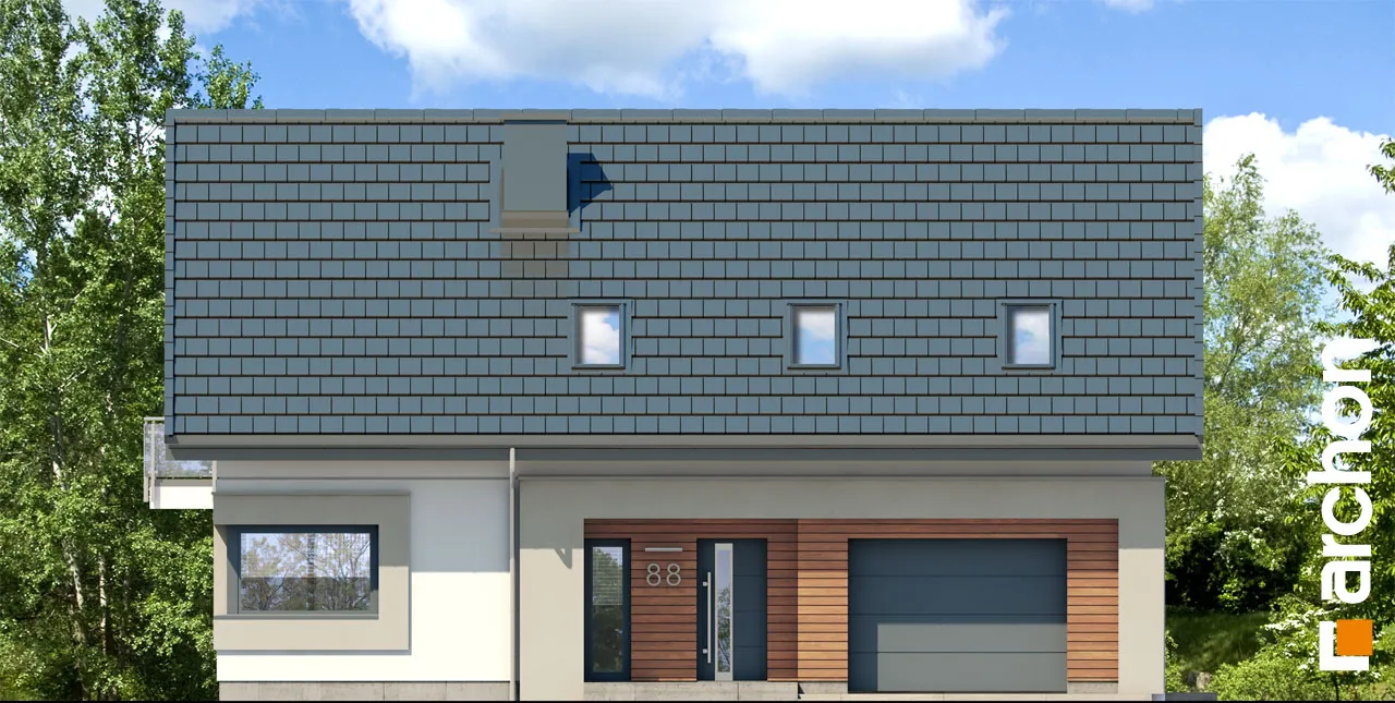 Это увеличенная версия проекта "Дом в гвоздиках", в котором было изменено расположение комнат в мансарде. Благодаря простой форме и примененным архитектурным решениям проект будет реализован эффективно и экономично. Двускатная крыша покрыта плоской черепицей антрацитового цвета, к которой соответствующим образом подобраны тона деревянной отделки. Современный облик дома обеспечивается интересным сочетанием фасадных материалов и деталей. Одно из них - угловое окно, выделенное рамой из более темной штукатурки. Терраса, покрытая перголой, является уютным местом для отдыха, где размещается как обеденная часть, так и часть для отдыха. Правильно расположенное остекление обеспечивает оптимальное поступление солнечного света в жилую зону. В гостиной установлены широкие двери на террасу с раздвижной системой открывания, что расширяет возможности дизайна интерьера. У большого окна в столовой можно накрыть удобный обеденный стол для всей семьи, а на полуострове, отделяющем столовую от кухни, расположены шкафы для хранения столовой посуды. Светлая, просторная кухня предлагает комфортные условия для работы, с просторными столешницами, высокими шкафами и кладовой. Комната рядом с гостиной с широким выходом на террасу может быть использована в качестве кабинета. Из тамбура можно попасть в гараж и далее в котельную на твердом топливе. Мансарда - это приватное пространство дома, где четыре комнаты предлагают комфортный отдых, включая спальню родителей с гардеробом. Вторая гардеробная, общая для всех членов семьи, доступна из прихожей. В программе мансарды также предусмотрена удобная ванная комната с местом для ванны и душа, а также просторная прачечная с функцией сушилки. "Дом в Гоздиковцах 3" рекомендуется для реализации на участках с входом с юга, относится к популярным коллекциям: проекты домов недорогих в строительстве, проекты домов с жилой мансардой, проекты домов в современном стиле. Предложение включает другие версии проектов из семейства, такие как: "Дом в гвоздиках (Г2A)" с гаражом на две машины, "Дом в гвоздиках (П)" с подвалами.