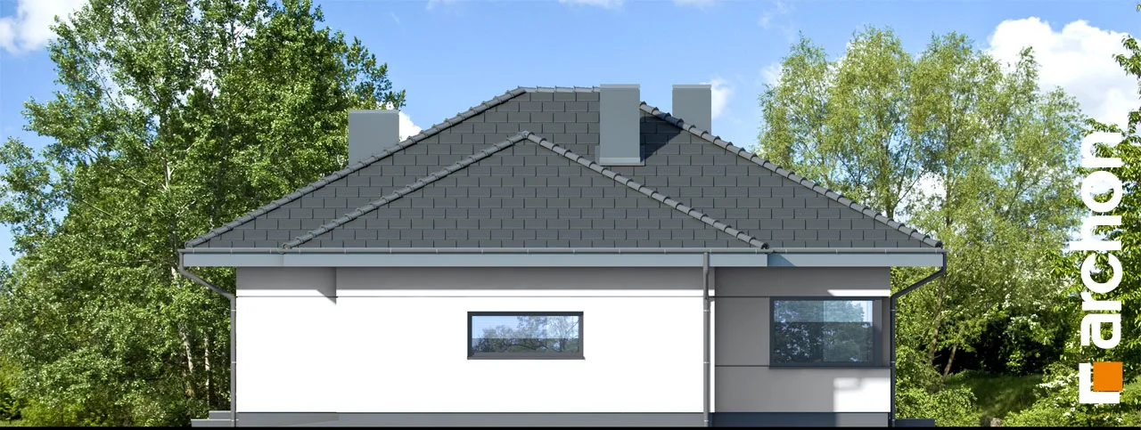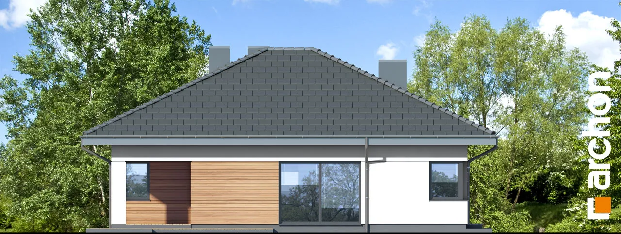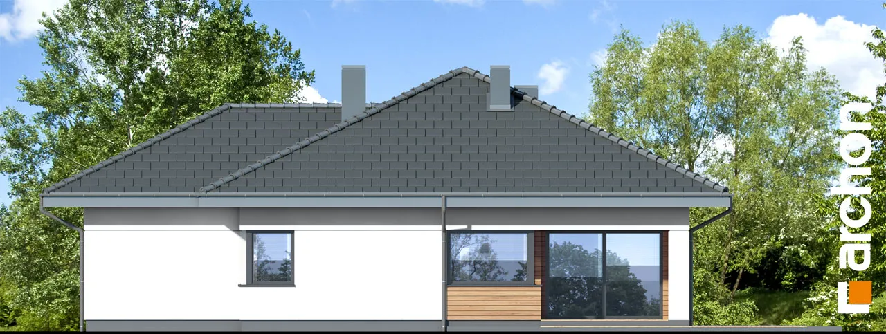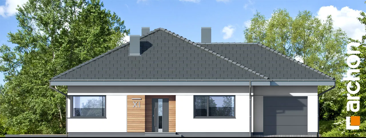 Современный одноэтажный дом с гаражом - еще одно интересное предложение в коллекции „хакетии”. Тщательная отделка в соответствии с современными тенденциями обеспечивает привлекательный внешний вид простого корпуса. Плоская плитка антрацитового цвета идеально сочетается с деревянной отделкой, а дерево добавляет естественный акцент. Со стороны сада была спроектирована терраса, покрытая аркадой, которая увеличивает жилую площадь дома и через раздвижное остекление органично соединяется с гостиной. Прекрасный вид на сад также открывает окно в столовой, где достаточно места для удобного стола для всей семьи. Преимущество кухни - оптимальная организация отдельных функций, в ее программу входит барная стойка и удобная кладовая. Ночная зона - это комфортное пространство для приватного отдыха с двумя комнатами для детей и спальней родителей с вместительной гардеробной. Максимальное удобство использования дома гарантируют два санузла. Гараж доступен через газовую котельную, в пределах которой может быть устроена прачечная. Представленный дом относится к категориям: проекты одноэтажных домов, проекты домов в современном стиле, проекты домов с гаражом на одну машину.