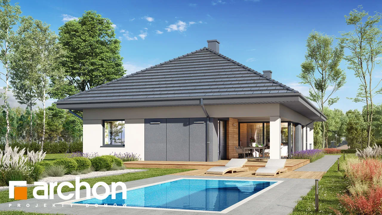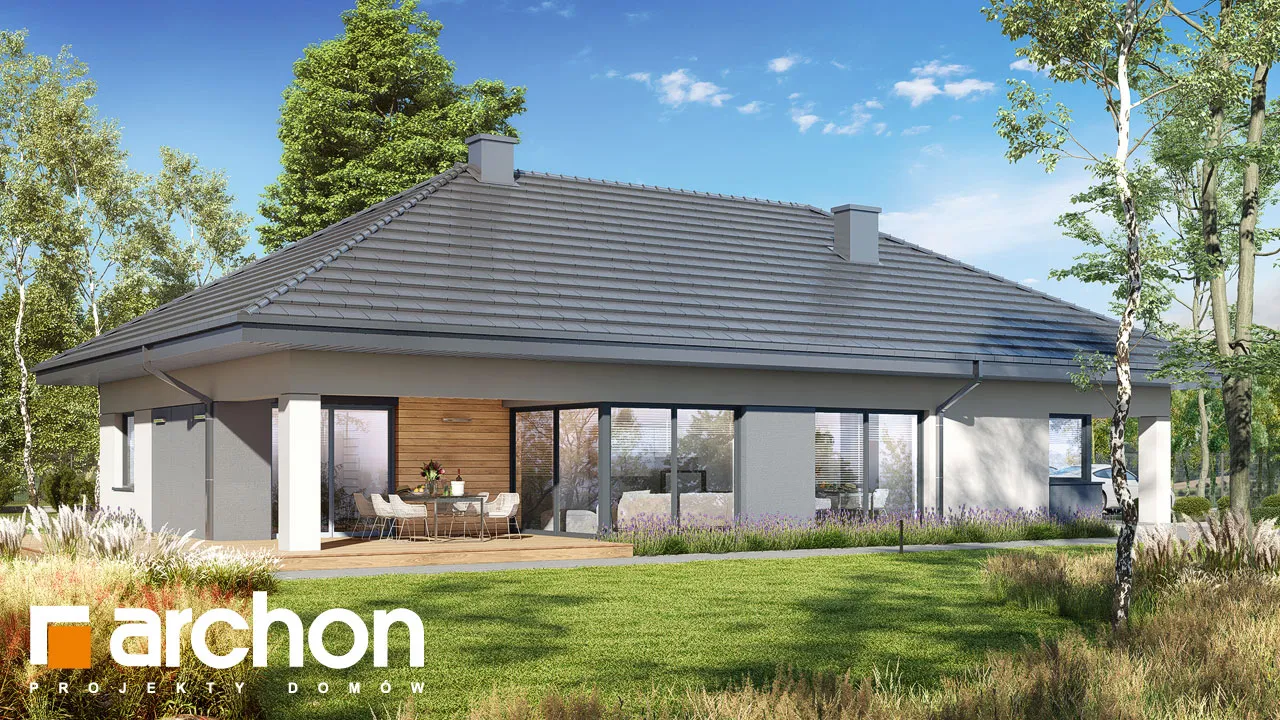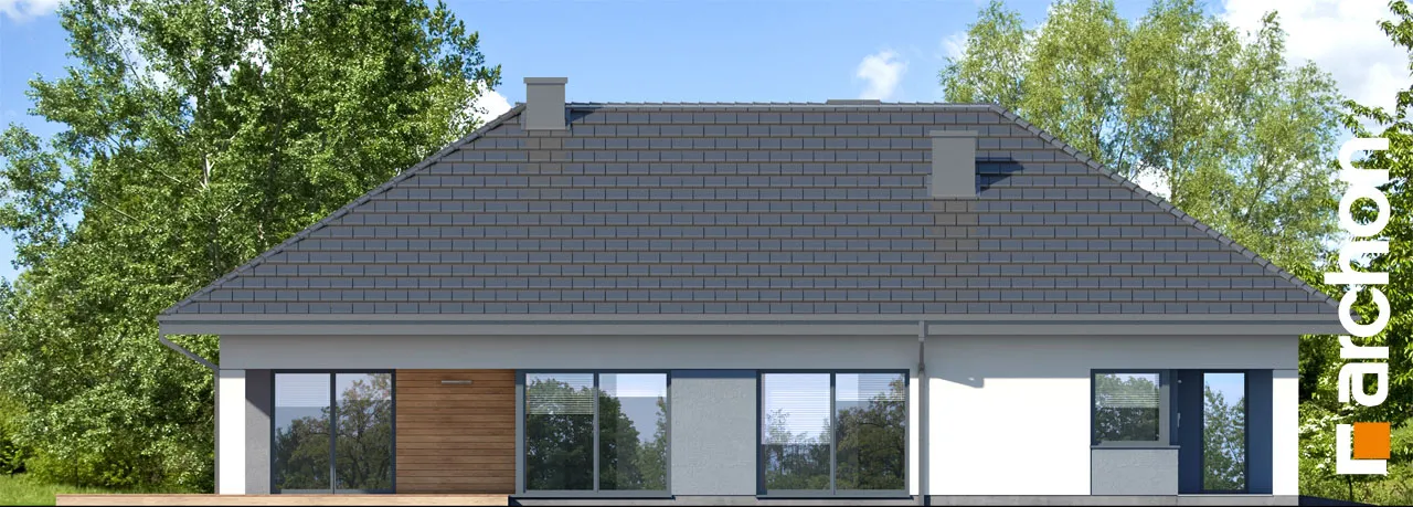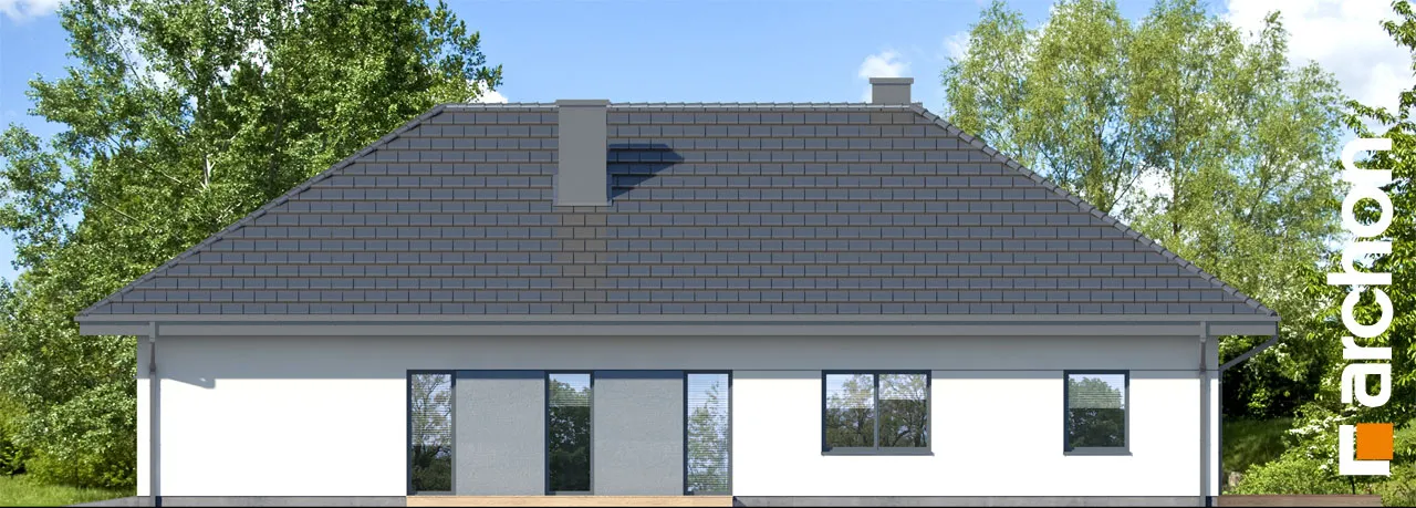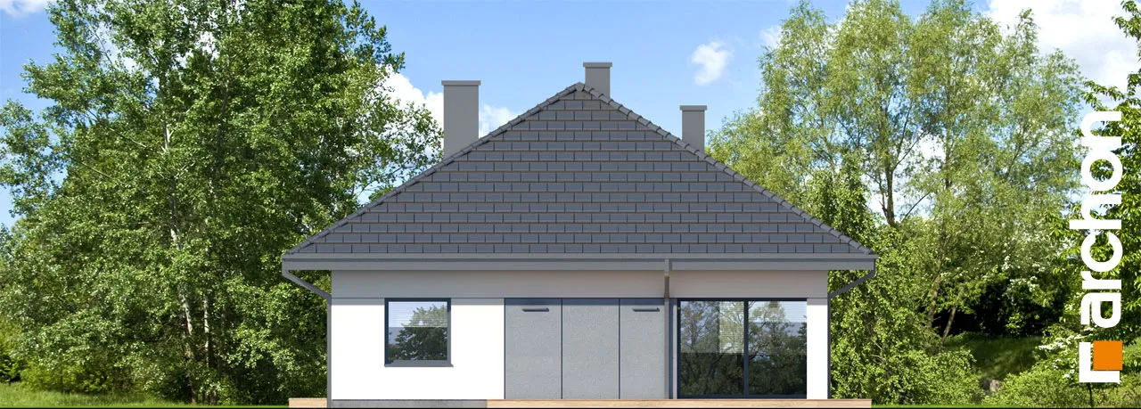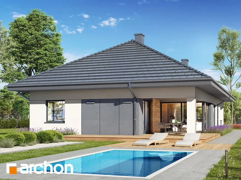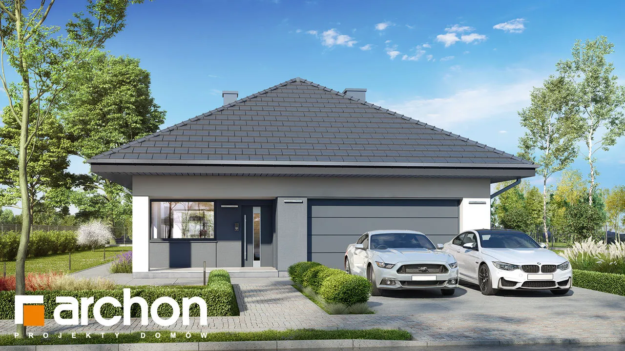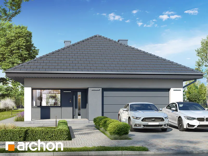 Проект одноэтажного дома в современном стиле с гаражом на две машины простой формы, покрытый шатровой крышей. Это еще одно интересное предложение с коллекции одноэтажных "Домов в хакетиях". Отделка фасада создает монохромную композицию, которая красиво подчеркивает характер дома и придает эффектный вид. Входная зона оформлена в виде аркады, что создает практичное укрытие от неблагоприятных погодных условий. Подобное решение было применено и на фасаде со стороны сада, благодаря чему расположенная там крытая терраса - идеальное место для летней столовой или кофейного уголка. Климатической выразительности зоне отдыха добавляет акцент в виде деревянной облицовки. В гостиную ведет прихожая со встроенными шкафами. Дневная зона впечатляет эффектным остеклением и раздвижным выходом на террасу, на которую также можно попасть прямо из спальни родителей. Большой угловой диван гарантирует комфортный семейный отдых в гостиной, а расположенный рядом камин создает уютную атмосферу. В центральной части дневной зоны находится столовая с видом на сад, которая органично соединяется с кухней, предлагая оптимально организованное и хорошо освещенное рабочее пространство. Здесь есть место для высокой мебели и вместительных столешниц для приготовления блюд. Ночная зона «Дом в хакетиях 11 (Г2)» включает в себя три комфортные спальни, полностью оборудованную ванную комнату с выходом на улицу и гардеробную. Пространство коридора в ночной части организовано очень практично, что позволяет установить несколько просторных шкафов, в которых можно хранить одежду и мелкую бытовую технику. Кроме того, в хозяйственную программу дома входит туалет и котельная с функцией прачечной, а быстрый доступ в гараж возможен через тамбур. Представленный проект относится к категориzv: проекты одноэтажных домов, проекты домов с гаражом на две машины, проекты домов в современном стиле. Предлагаются и другие варианты: «Дом в хакетиях 10» - с гаражом, «Дом в хакетиях 8» - проект одноэтажного дома без гаража.