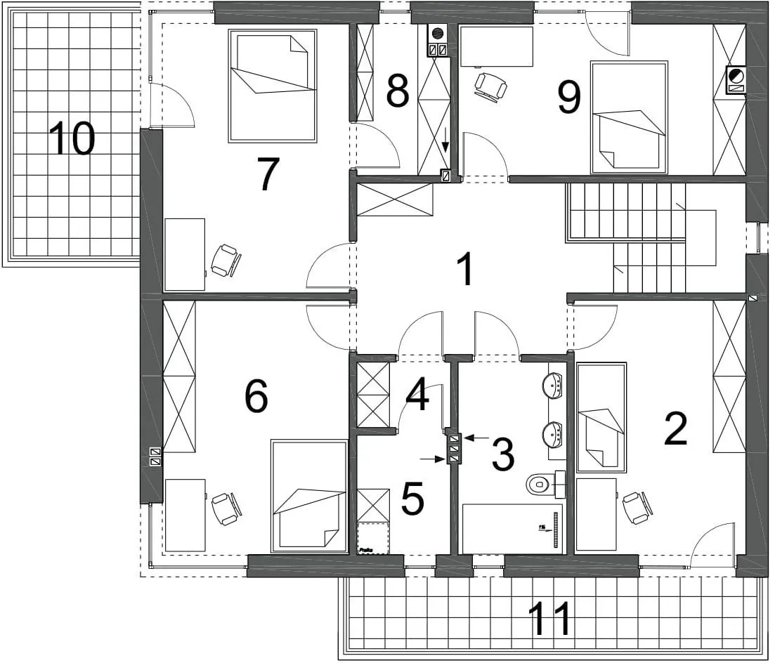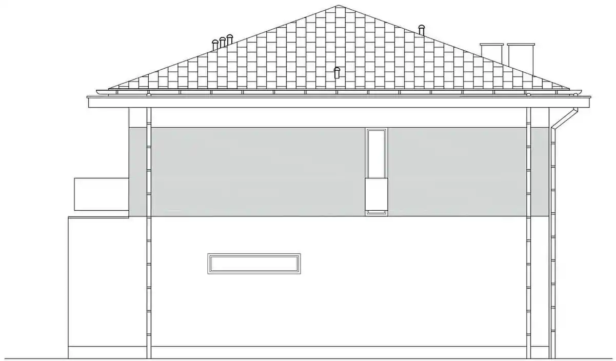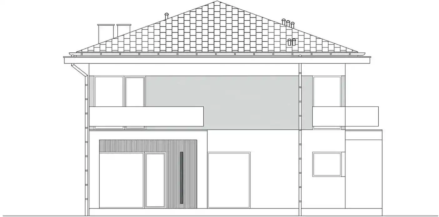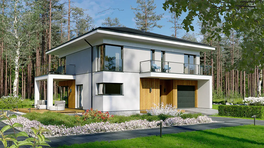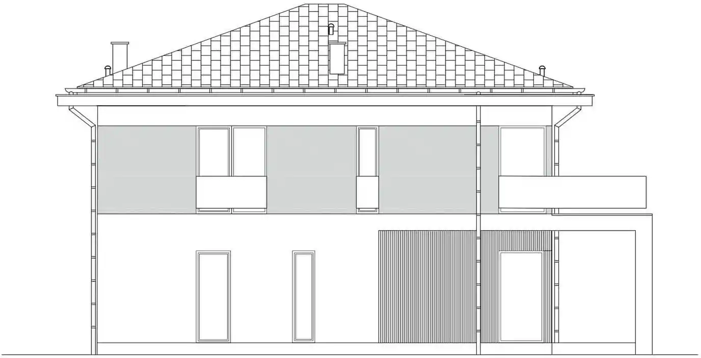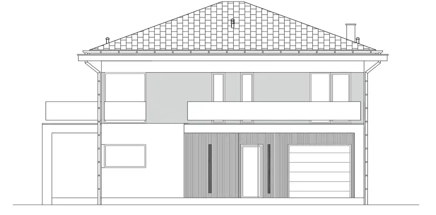 Двухсторонний дом с тазобедренной крышей. Оптимальная внутренняя функциональность в сочетании с современным стилем твердого тела. Вход в дом ведет через вестибюль и коридор, в котором разработан вход в отдельный гараж и техническую комнату, а также гостиная. У просторной гостиной есть место для большого дивана, стола, камина и посещения покрытой террасы. На первой полосе была разработана кухня с видом на вход и кладовую. Рядом с лестницей есть ванная комната, ведущая на первый этаж. На первом этаже разработаны 4 комнаты, из которых комната хозяев с гардеробом и выходом на балкон, общественная ванная комната и рядом с ним гардероб и белье. и серый и доска