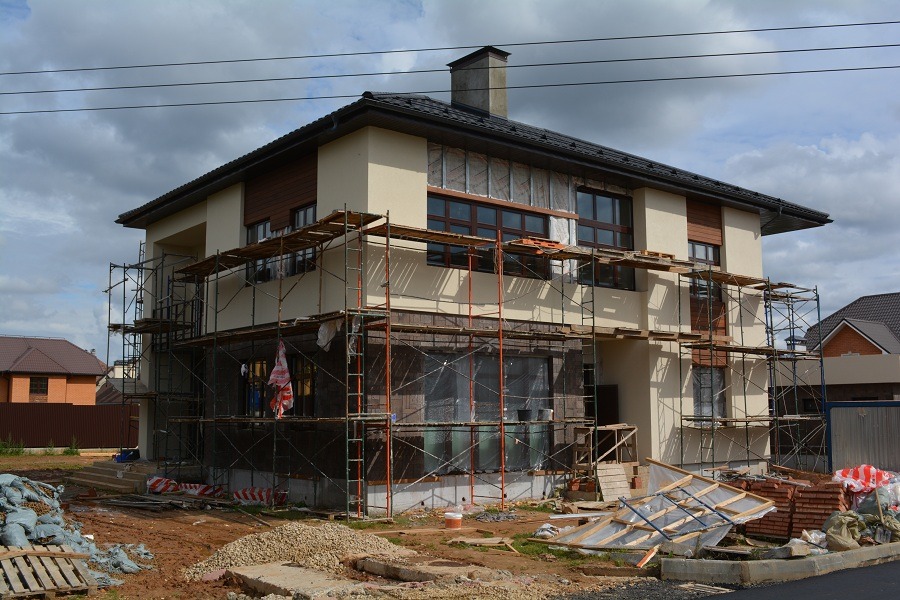 - Подготовка участка: очистка и выравнивание поверхности фасада, подготовка основания для нанесения штукатурки, включая грунтование для обеспечения надежной адгезии.